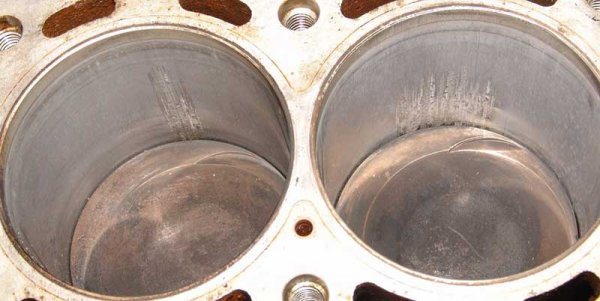 Такие неприятные вещи, как задиры и царапины на зеркале цилиндра, также способствуют проникновению масла. Причинами таких дефектов могут стать: